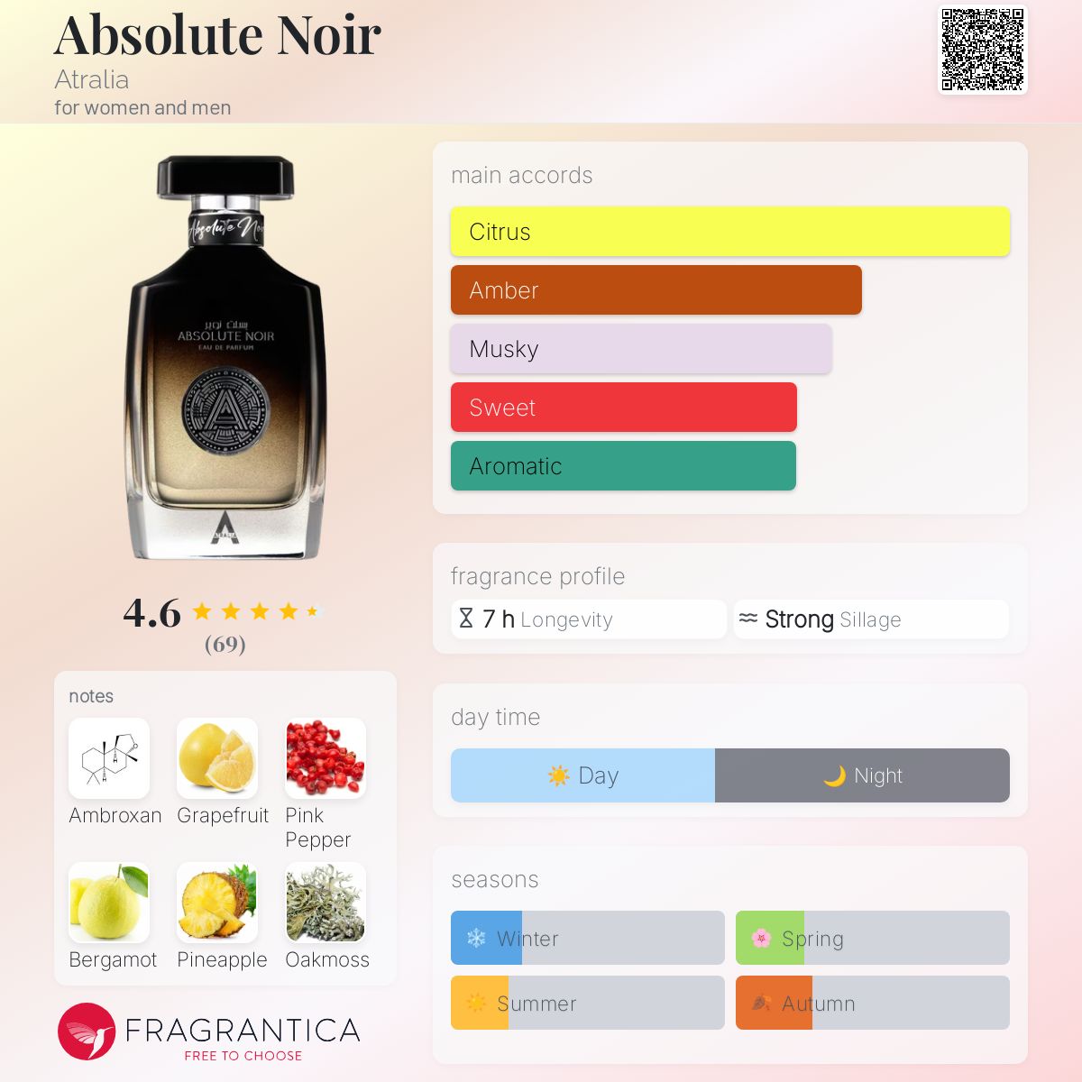 Absolute Noir by Atralia is a Woody Aromatic fragrance for women and men. This is a new fragrance. Absolute Noir was launched in 2024. Top notes are Grapefruit, Pink Pepper, Bergamot and Lemon; middle notes are Ambroxan, Pineapple and Watermelon; base notes are Moss, Patchouli and Vetiver.