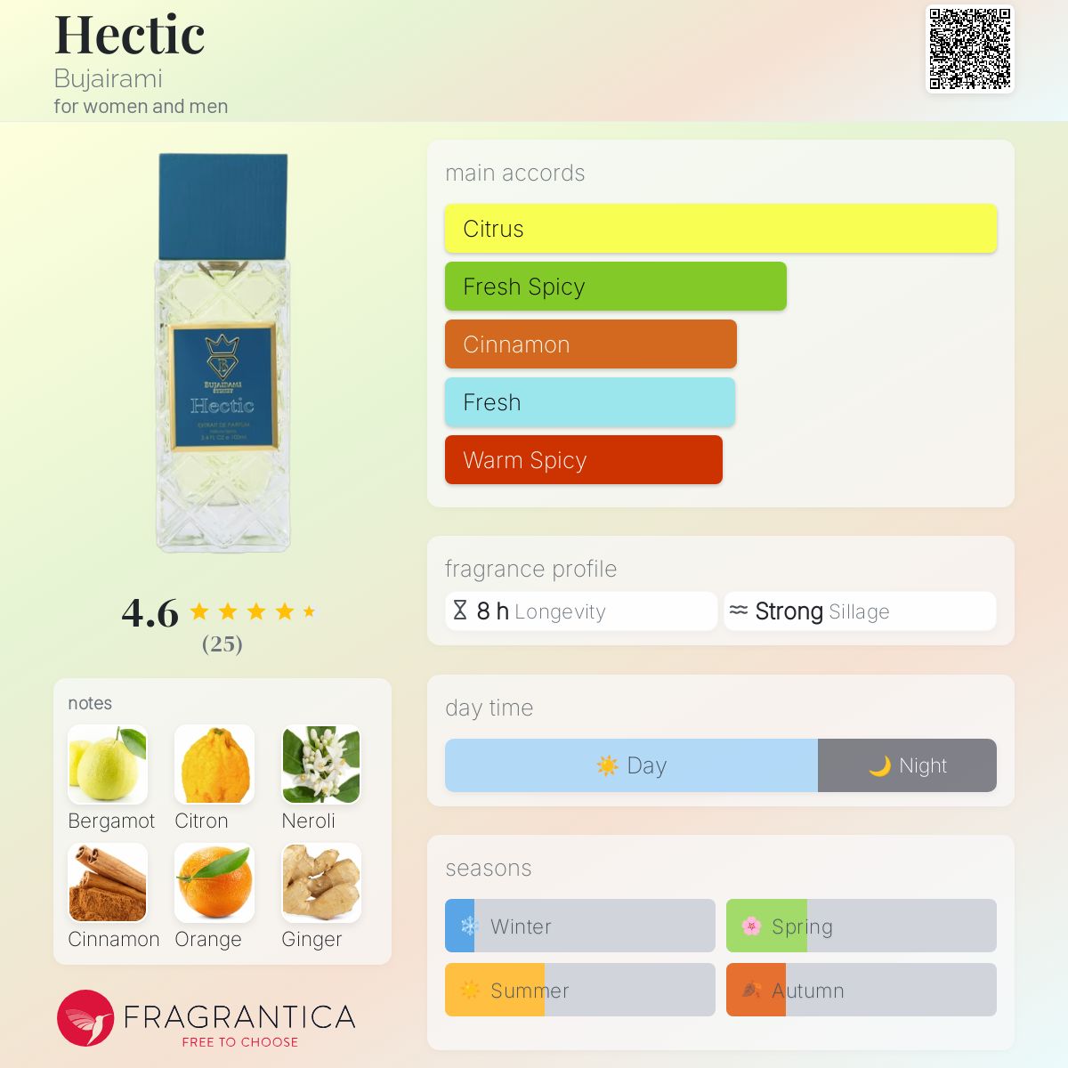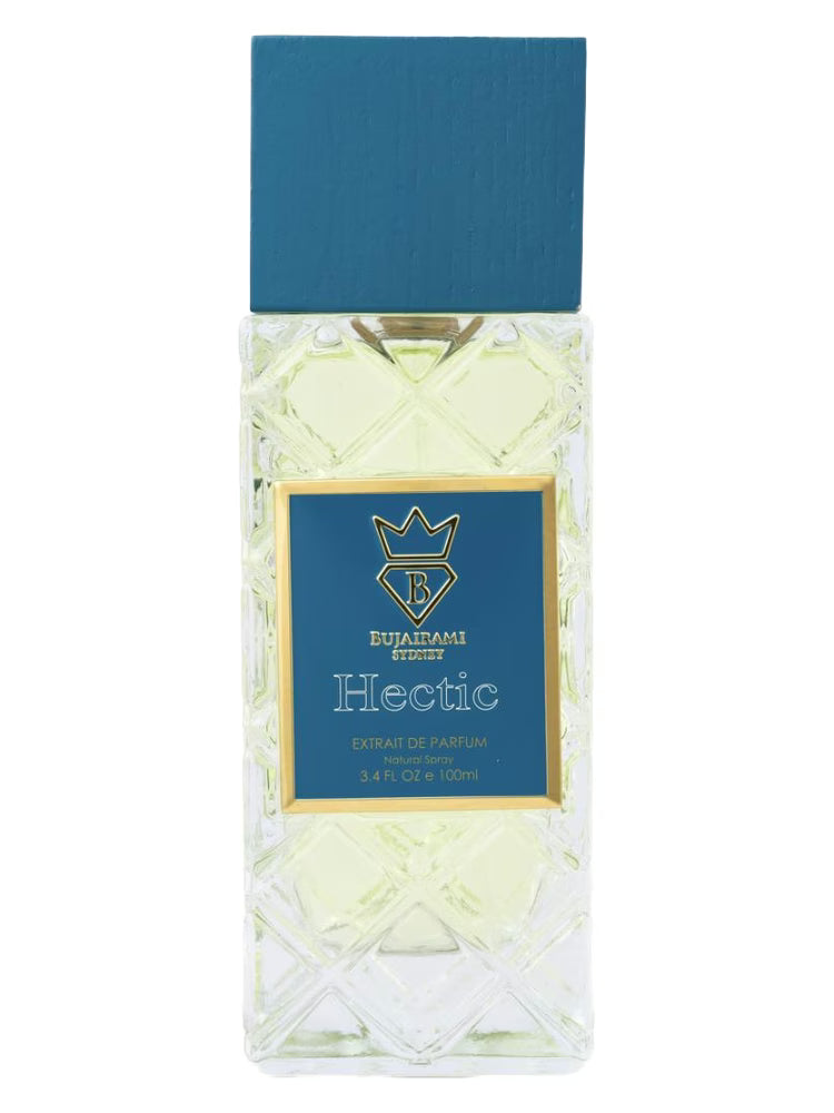 Hectic by Bujairami is a fragrance for women and men. Hectic was launched in 2024. The nose behind this fragrance is Adam Bujairami. Top notes are Calabrian bergamot, Citron and Sicilian Orange; middle notes are Tunisian Neroli, Ceylon Cinnamon and Nigerian Ginger; base notes are Ambroxan and Guaiac Wood.