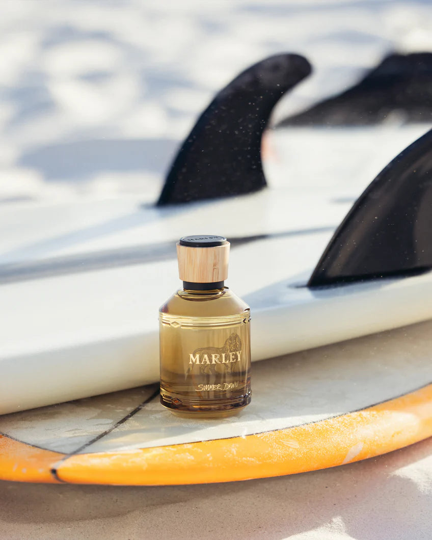 Deep, invigorating, and effortlessly cool, Simmer Down embodies a quiet strength and playfulness. This fragrance opens with the juicy brightness of bergamot and star apple, balanced by the subtlety of pear blossom and cinnamon leaf. As it settles, rich amberwood and sandalwood create a warm, strong finish that embodies resilience and coming together as one. Let Simmer Down channel Marley's message of living in unity and confidence—embracing the joyfulness of life.